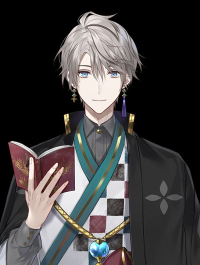 Kaida Haru’s design pairs a gentle, scholarly aesthetic with modern idol touches: short sandy grey hair, light-colored eyes, earrings, and a robe-inspired outfit with teal accents. His look blends traditional motifs with a relaxed, musician-friendly wardrobe and stage-ready accessories.
