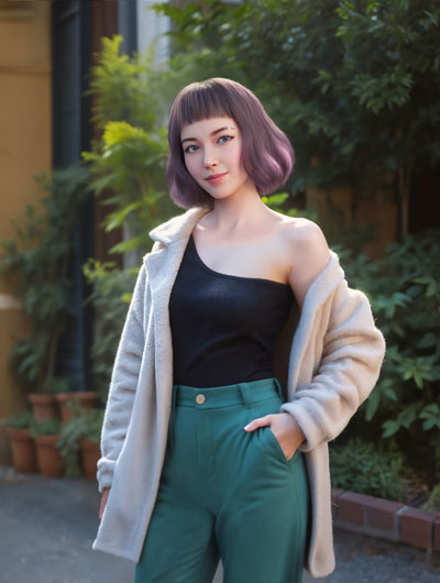 Rae’s look blends hyper-real CGI with streetwear and contemporary fashion influences. Her imagery frequently pairs urban backdrops, skate culture motifs, and bold hair and styling choices that emphasize a modern, edgy aesthetic. Rae also appears in stylised digital artwork and portraits that highlight texture, color contrast, and fashion-forward looks.
